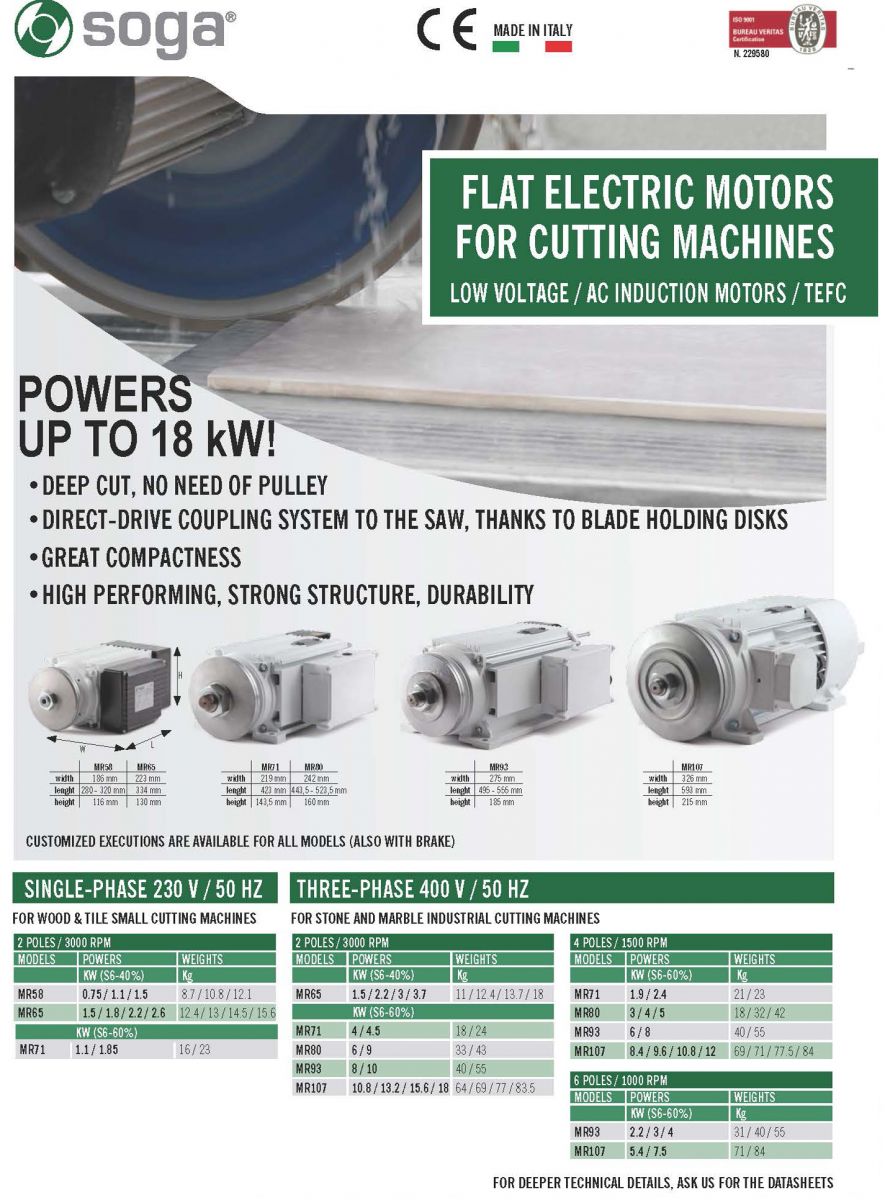 意大利Soga石材切割機(jī)MR系列,一款臥式,三相/單相低壓交流感應(yīng)切割電機(jī),轉(zhuǎn)速有3000轉(zhuǎn),1500轉(zhuǎn),1000轉(zhuǎn)。MR58/MR65/MR71/MR80/MR93系列防護(hù)等級(jí)IP55,MR107系列防護(hù)等級(jí)IP65。切割電機(jī)功率高達(dá)18KW,切割能力強(qiáng),不需要滑輪帶動(dòng),直接驅(qū)動(dòng)耦合系統(tǒng)的鋸,因刀片的持有磁盤(pán)。密實(shí)度強(qiáng),性能良好,結(jié)構(gòu)堅(jiān)固耐用。MR58/MR65/MR71用于木材和瓷磚的小型切割設(shè)備,MR80/MR93/MR107用于石材和大理石工業(yè)的切割機(jī)。